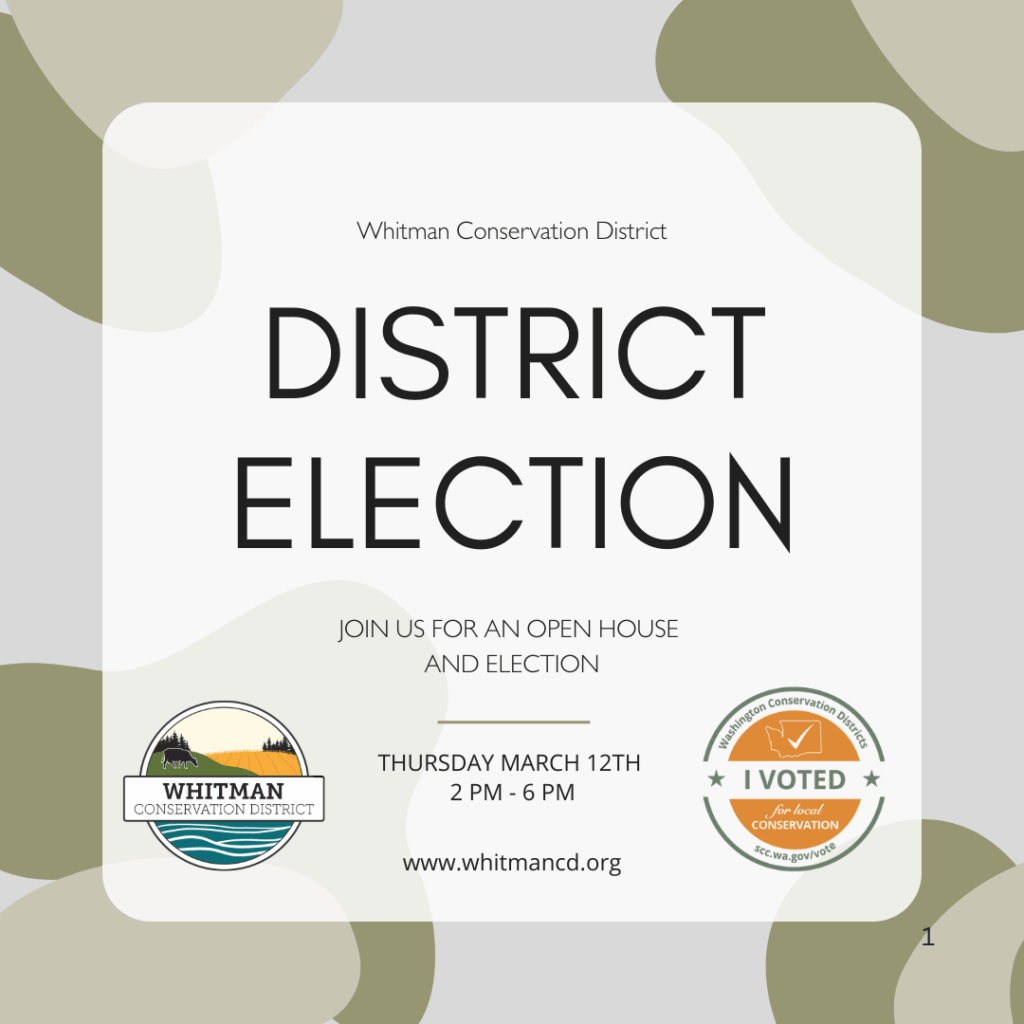 Interested candidates must be registered voters who reside within the boundaries of the District. Candidates may be required to be landowners or operators of a farm, depending on the current composition of the District board of supervisors. The filing deadline for candidates to file their candidate required information is February 09th, 2026 at 4pm. Interested candidates must file their candidate required information at Whitman Conservation District at 614 N. Mill Street, Colfax, WA 99111.